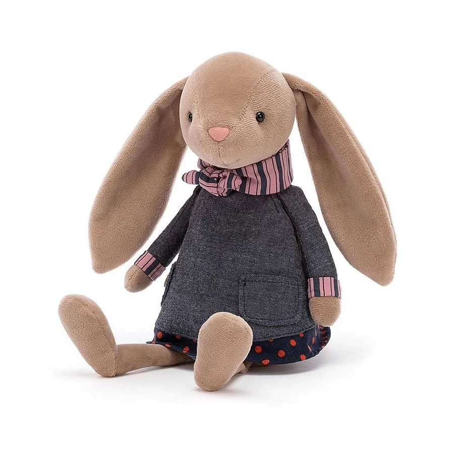 Riverside Rambler rabbit van Jellycat is klaar om op avontuur te gaan. Dit knuffelkonijn heeft een mooie blauwe denim jurk aan en haar mooiste sjaal om. Kijk eens naar de omslag van de mouwen van haar jurk. Hoogte (zittend): 21 cm.