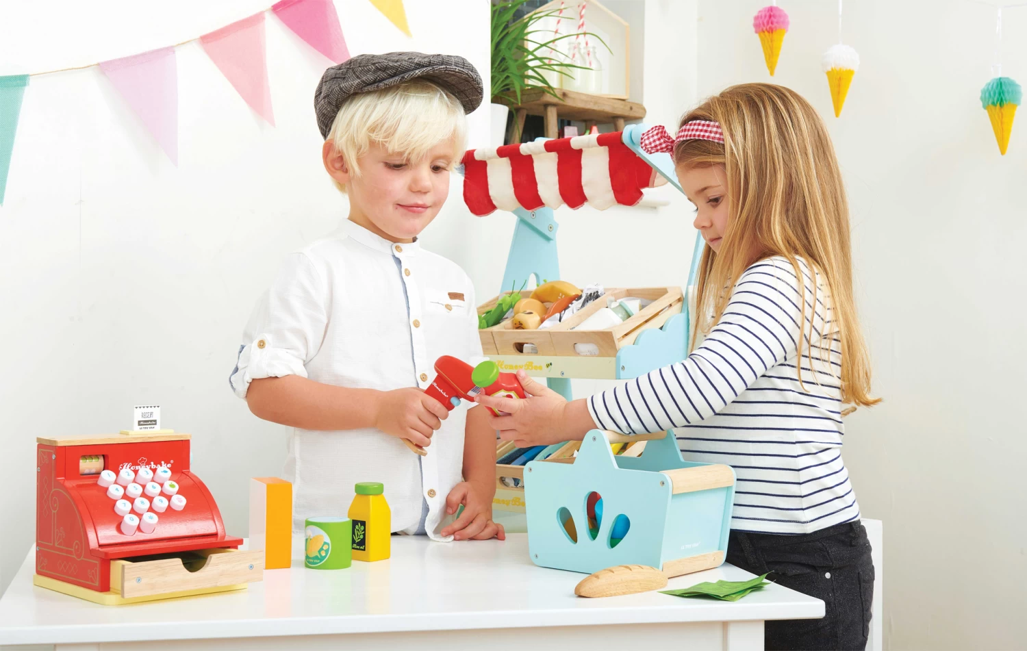 Elk kruideniersartikel is geïllustreerd en zit boordevol prachtige details, waaronder een blikje tonijn, boter, stokbrood, koekjes, maïs, ketchup, olijfolie, spaghetti, chocolade en cornflakes.