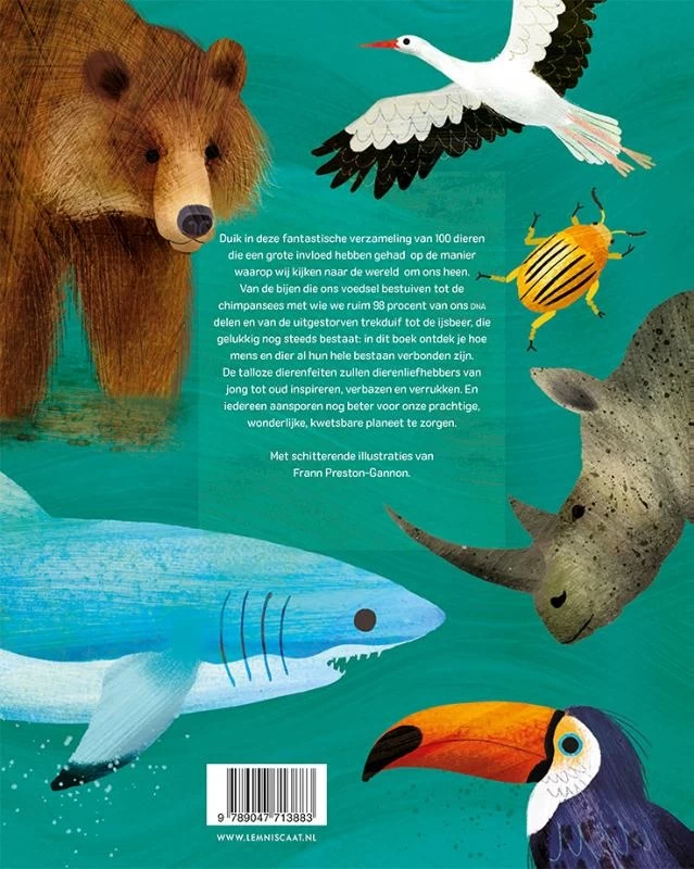 Nu heeft hij zijn verhalen over deze 100 dieren herschreven voor kinderen, en de illustrator van Ik wou dat ik een vogel was, Frann Preston-Gannon,maakte er 100 schitterende dierenplaten bij. Van de bijen die ons voedsel bestuiven tot de chimpansees die ruim 98% van ons DNA delen en van de uitgestorven trekduif tot de ijsbeer, die gelukkig nog steeds bestaat: in dit boek ontdek je hoe mens en dier al hun hele bestaan verbonden zijn. De talloze dierenfeiten zullen dierenliefhebbers van jong tot oud inspireren, verbazen en verrukken. En iedereen aansporen om nog beter voor onze prachtige, wonderlijke, kwetsbare planeet te zorgen.