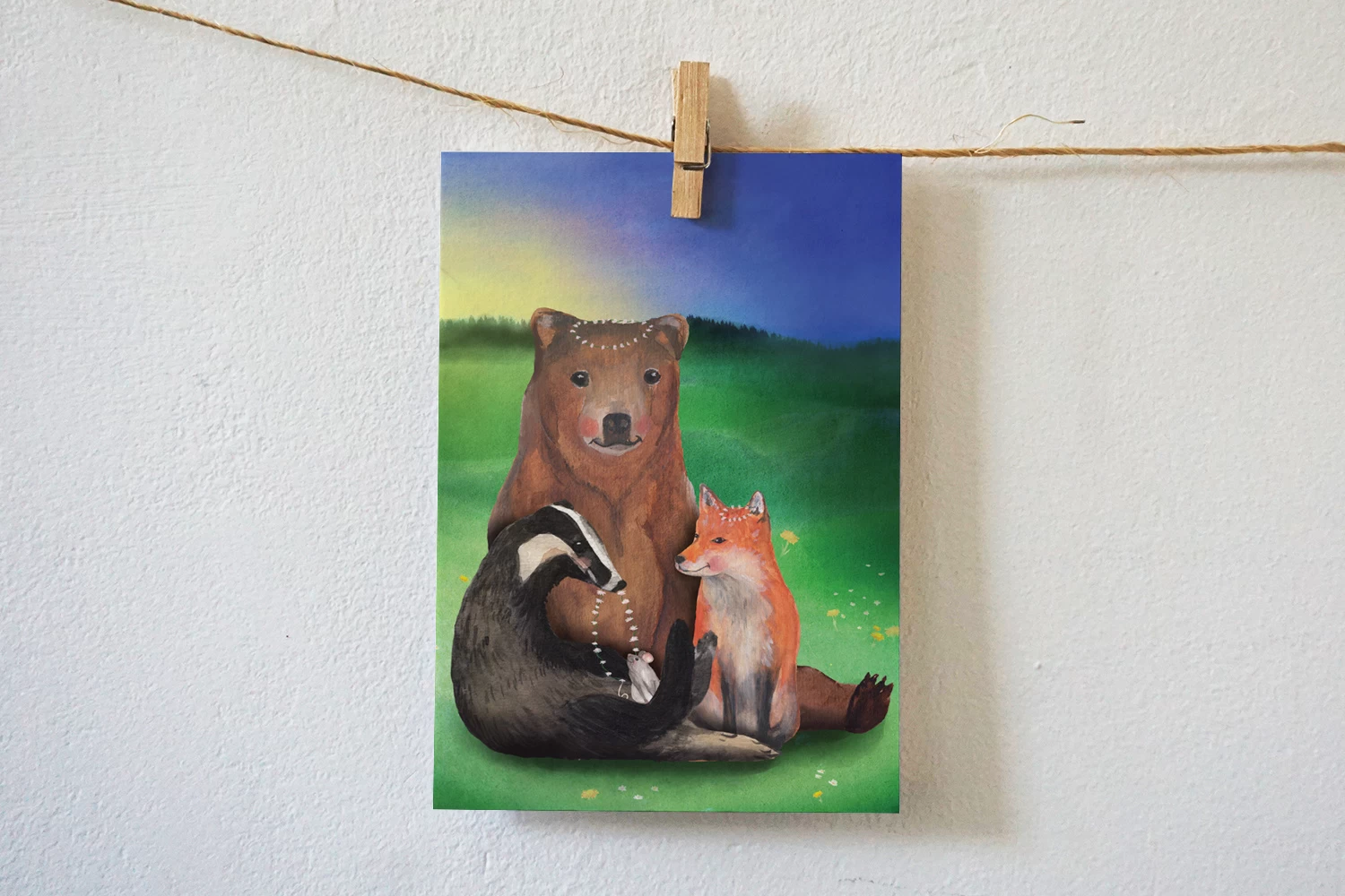 Kaart bloemenketting maken door bosdieren! Een betoverende illustratie van das die bloemenkettingen maakt voor zijn vrienden beer, muis en vos. Heerlijk in het groene gras genieten van de geur van de lente of zomer met een mooie ketting van madeliefjes! V