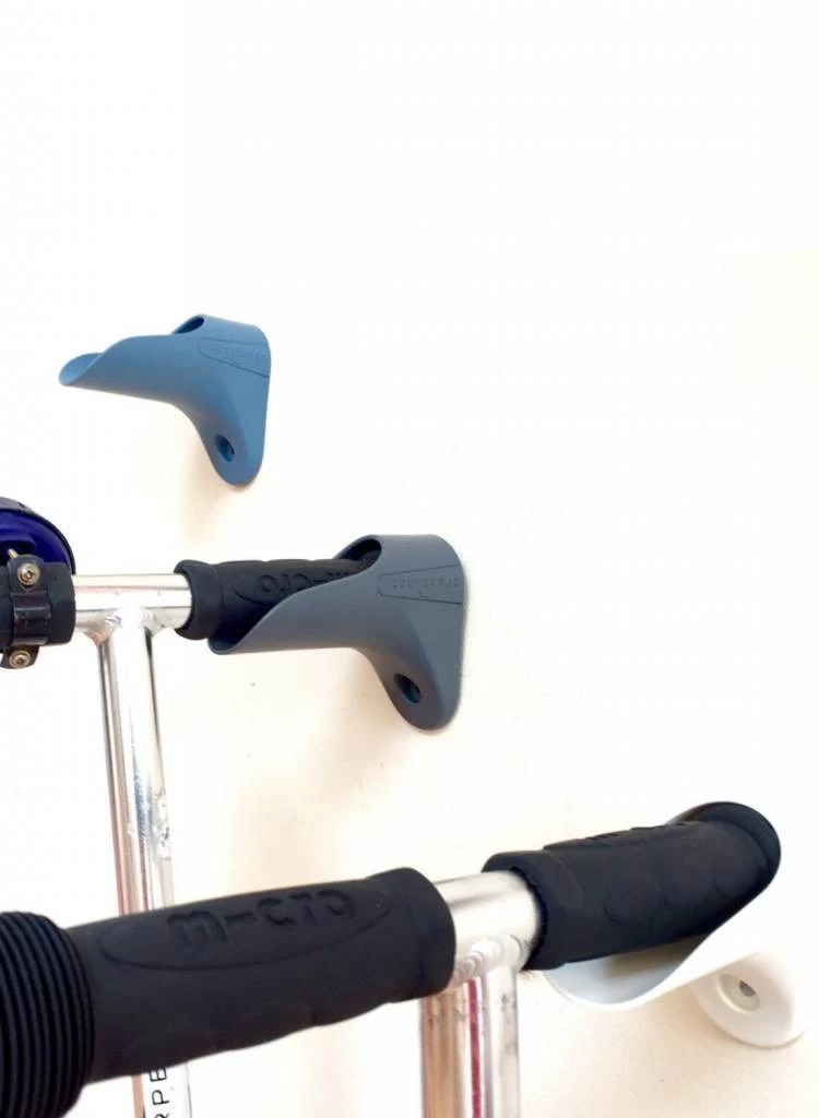 Een slimme haak waaraan je de Micro Step thuis op kunt hangen. Makkelijk te bevestigen. Zo staan de steps niet in de weg in de gang of schuur en blijft alles netjes opgeruimd. Geschikt voor kleine en grote 3 wielige steppen. De haak is grijs gekleurd.