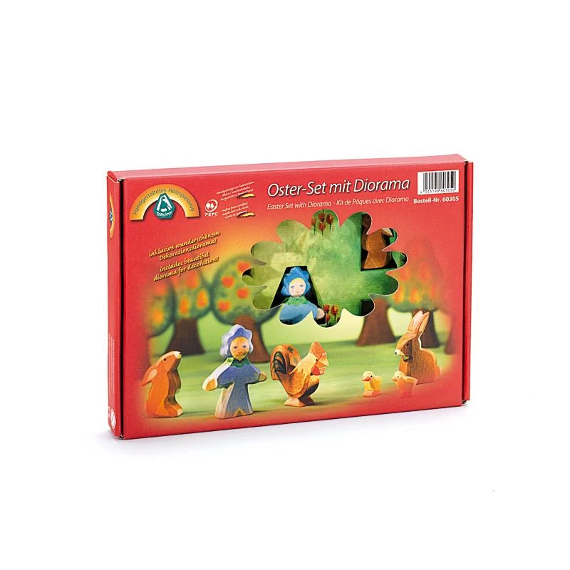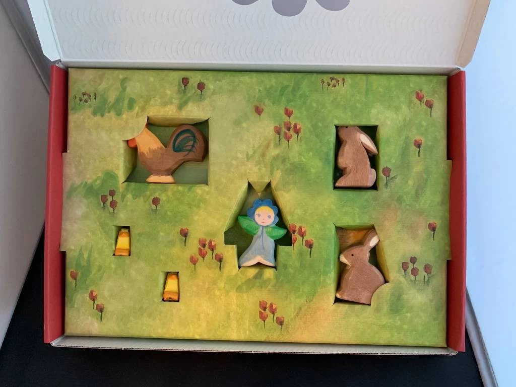Deze 7-delige set bestaat uit de volgende Ostheimer figuren: Bloemenkind, haas oren omhoog en haas oren naar beneden, Haan en 2 x het lichte kuiken. In de doos zit een diorama waar je de figuren voor kunt zetten. Een mooi cadeau voor Pasen.