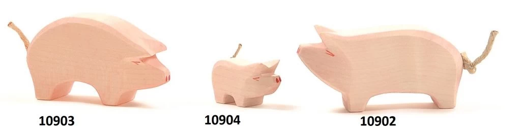 Dit met de hand en uit hout gesneden varken van Ostheimer komt uit de serie boerderijdieren. Dit varken heeft de snuit omhoog. Hoogte: 6Â cm
