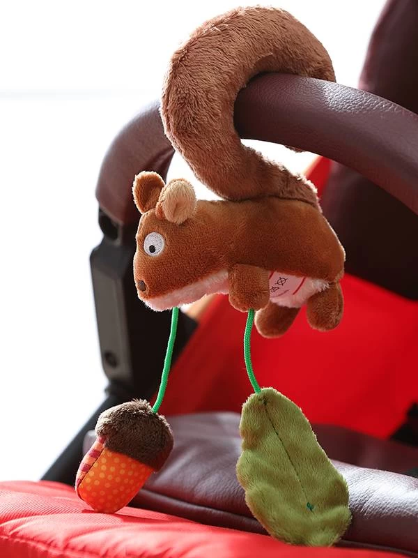 Met deze cliphanger Eekhoorn van sigikid zal een autorit nooit lang duren. Je hangt hem met zijn staart om de beugel van de Maxi-cosi. Het blaadje knispert en het eikeltje is een rammelaartje.