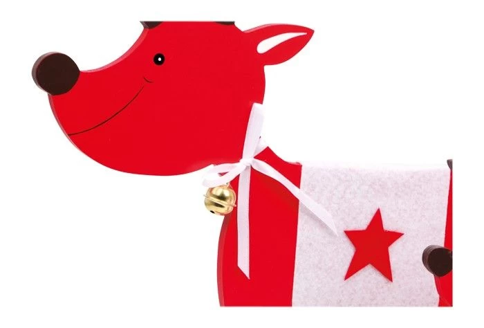 Set van 4 prachtig staande houten decoratie rendieren. Als blikvanger in arrangement of afzonderlijk opgesteld. Kleine belletjes en dekens van vilt met houten sterren sieren deze rood gelakte houten elanden.