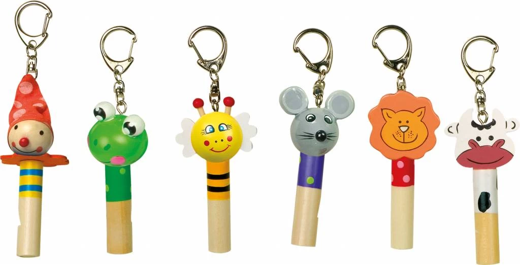 Set van 6 grappige houten sleutelhangers. Deze sleutelhanger is ook als een fluitje te gebruiken. Ook leuk om uit te delen bij je verjaardagsfeestje! Lengte: 7.5 cm.