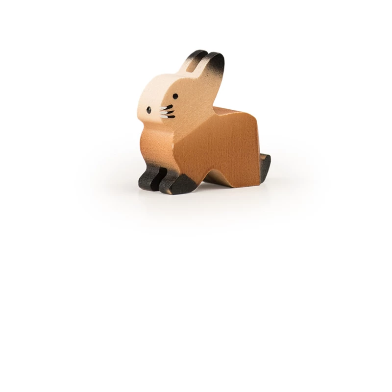 Deze haas van Trauffer zit en kijkt recht voor zich uit en is met de hand gemaakt van lindehout in Zwitserland, de gebruikte verf is vrij van chemicaliën. De haas is robuust genoeg om mee te spelen. Hoogte: 3 cm.